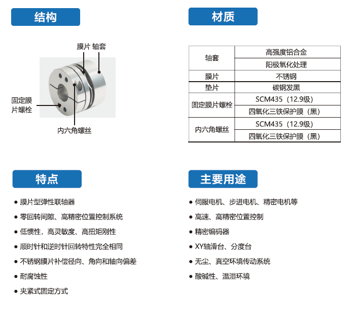 DFPA-C系列聯軸器采用高強度鋁合金材料,經過陽極氧化處理,廣泛用于伺服電機、步進電機、精密電機等。
