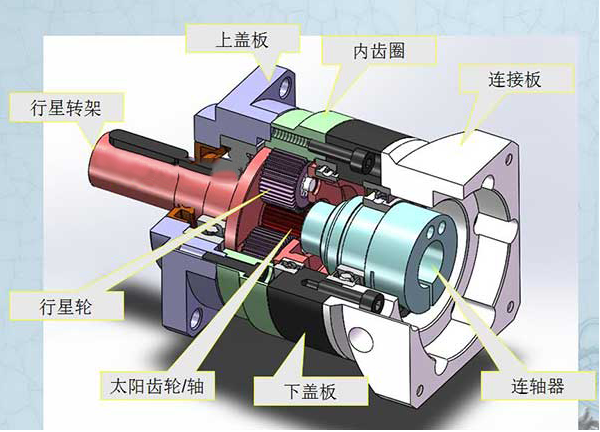 精密斜齒行星減速機的結構是十分緊湊的,從上圖中我們可以看出行星減速機的結構也是十分簡單的,主要包括:連接板、聯軸器、下蓋板、太陽齒輪、行星輪、內齒圈、上蓋板和行星轉架。