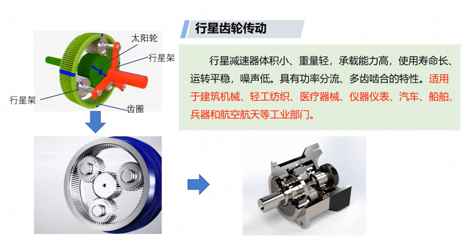 行星減速機,其包括:行星輪、太陽輪和外齒圈。行星減速器體積小、重量輕,承載能力高,使用壽命長、運轉平穩(wěn),噪聲低。具有功率分流、多齒嚙合的特性。適用于建筑機械、輕工紡織、醫(yī)療器械、儀器儀表、汽車、船舶和航空航天等領域。