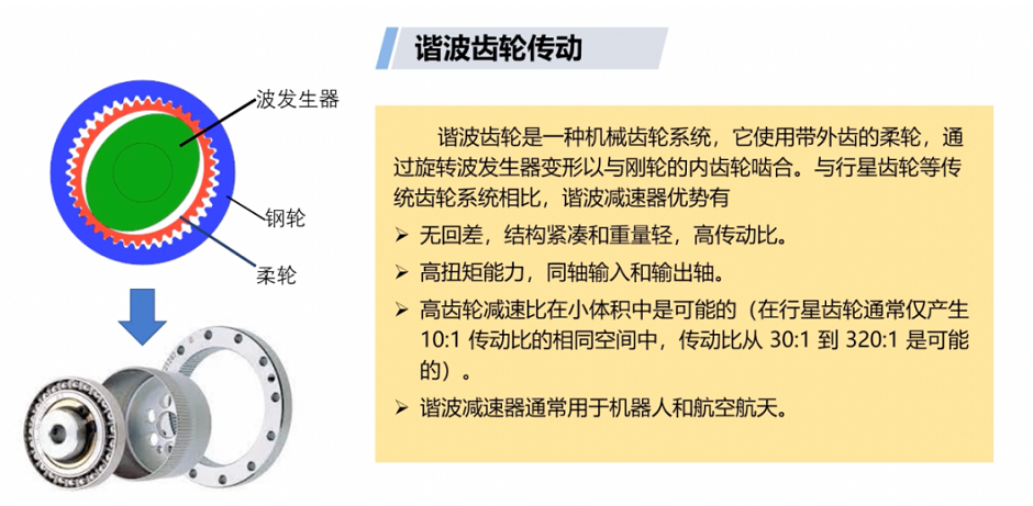 諧波減速機,其通過具有柔性的薄壁外齒齒輪產(chǎn)生彈性變形后與剛性的內(nèi)齒輪進行內(nèi)嚙合來實現(xiàn)傳動的。它由剛輪、柔輪,波發(fā)生器三大傳動元件組成。諧波減速機傳動比大,無回差,結構緊湊和重量輕,高精度等優(yōu)點在機器人及自動化技術領域發(fā)揮舉足輕重的作用,我國自1980年開始進行諧波減速器標準化和系列化;1985年制定了中小功率通用諧波減速器系列標準,成為世界第四個擁有通用諧波減速標準的國家。