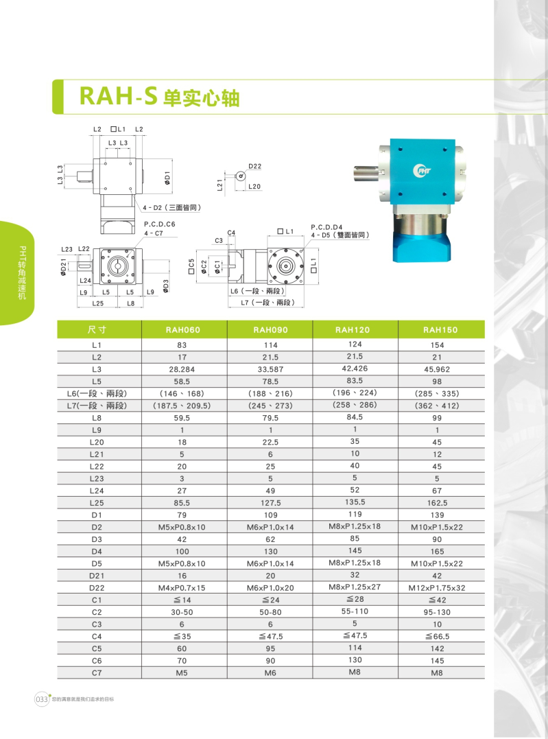 RAH-S系列是單實心軸設計。 鋁合金材質(zhì)可提高散熱能力,減緩溫升現(xiàn)象造成影響。 多樣化的出力軸可因應各種場合,客制化的入力端可搭配各式馬達。 提供各式特色之減速機,供使用者依需求選購。 特殊油封設計,正常使用下不需保養(yǎng)亦不用更換潤滑油,可延長使用壽命。 各式特色,體積小,省空間,噪音低,輸出扭矩高,安裝容易,可搭配馬達型號廣泛。 RAH搭配DM,一體成型的齒輪組,可有效的減低噪音。 RAH搭配DH,最佳的性價比,可廣泛應用于各種場合。