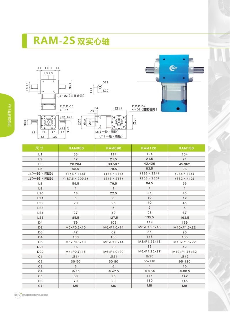 PHT(品宏行星減速機(jī)) RAM-2S系列是雙實心軸設(shè)計。 鋁合金材質(zhì)可提高散熱能力,減緩溫升現(xiàn)象造成影響。 多樣化的出力軸可因應(yīng)各種場合,客制化的入力端可搭配各式馬達(dá)。 提供各式特色之減速機(jī),供使用者依需求選購。 特殊油封設(shè)計,正常使用下不需保養(yǎng)亦不用更換潤滑油,可延長使用壽命。 各式特色,體積小,省空間,噪音低,輸出扭矩高,安裝容易,可搭配馬達(dá)型號廣泛。 RAM搭配DM,一體成型的齒輪組,可有效的減低噪音。 RAM搭配DH,最佳的性價比,可廣泛應(yīng)用于各種場合。