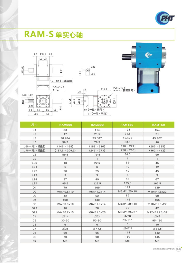 RAM-S系列是單實(shí)心軸設(shè)計(jì)。 鋁合金材質(zhì)可提高散熱能力,減緩溫升現(xiàn)象造成影響。 多樣化的出力軸可因應(yīng)各種場合,客制化的入力端可搭配各式馬達(dá)。 提供各式特色之減速機(jī),供使用者依需求選購。 特殊油封設(shè)計(jì),正常使用下不需保養(yǎng)亦不用更換潤滑油,可延長使用壽命。 各式特色,體積小,省空間,噪音低,輸出扭矩高,安裝容易,可搭配馬達(dá)型號(hào)廣泛。 RAM搭配DM,一體成型的齒輪組,可有效的減低噪音。 RAM搭配DH,最佳的性價(jià)比,可廣泛應(yīng)用于各種場合。