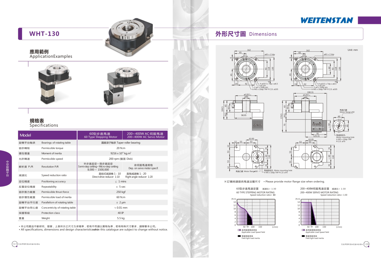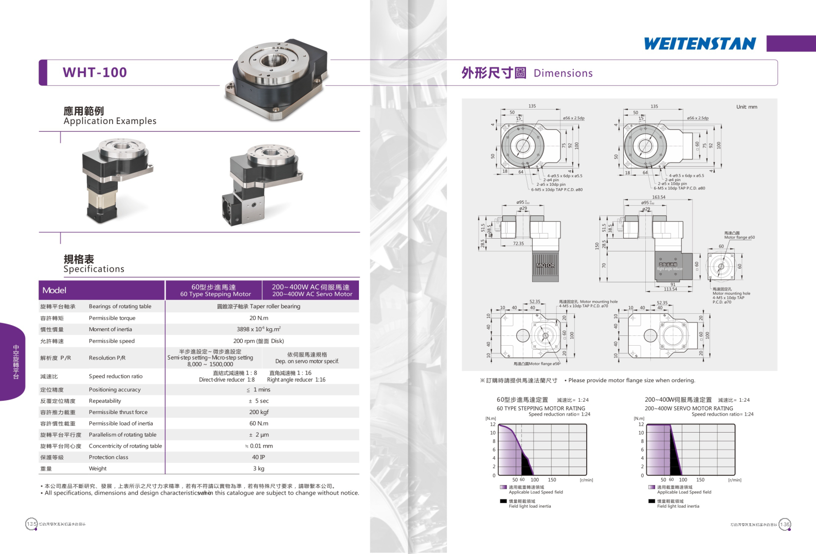 WHT系列中空旋轉(zhuǎn)平臺。 具有優(yōu)異定位精度與重復(fù)精度的中空旋轉(zhuǎn)平臺,可搭配使用伺服馬達(dá)或步進(jìn)馬達(dá),展現(xiàn)獨(dú)特的性能可靠度。 工作物可直接鎖固。旋轉(zhuǎn)盤面可直接鎖固工作物,提升工件裝載之方便性。 配線方便。此旋轉(zhuǎn)平臺為中空式設(shè)計,無論是配線或配管均方便。 高精度。定位精度小于1分。重復(fù)精度可達(dá)±5秒。 運(yùn)轉(zhuǎn)動作平穩(wěn)。盤面轉(zhuǎn)動平穩(wěn),順暢,且定位快速。 適用各種馬達(dá)。中空旋轉(zhuǎn)平臺可采用各種廠牌之伺服馬達(dá)或步進(jìn)馬達(dá)驅(qū)動。