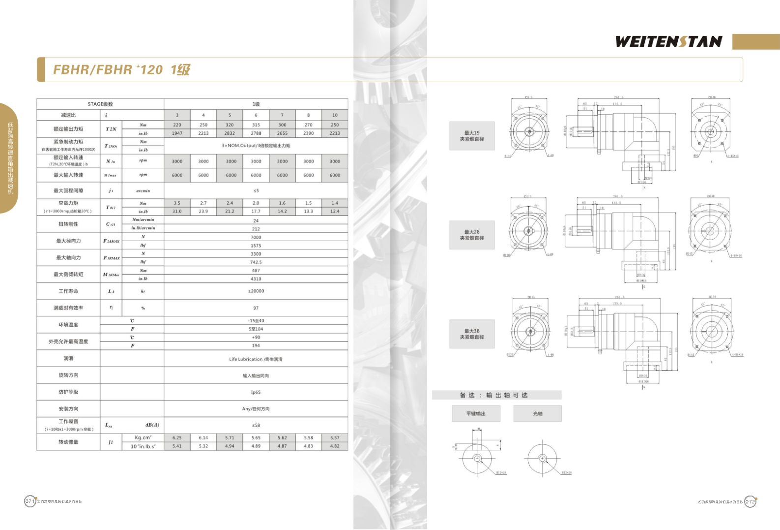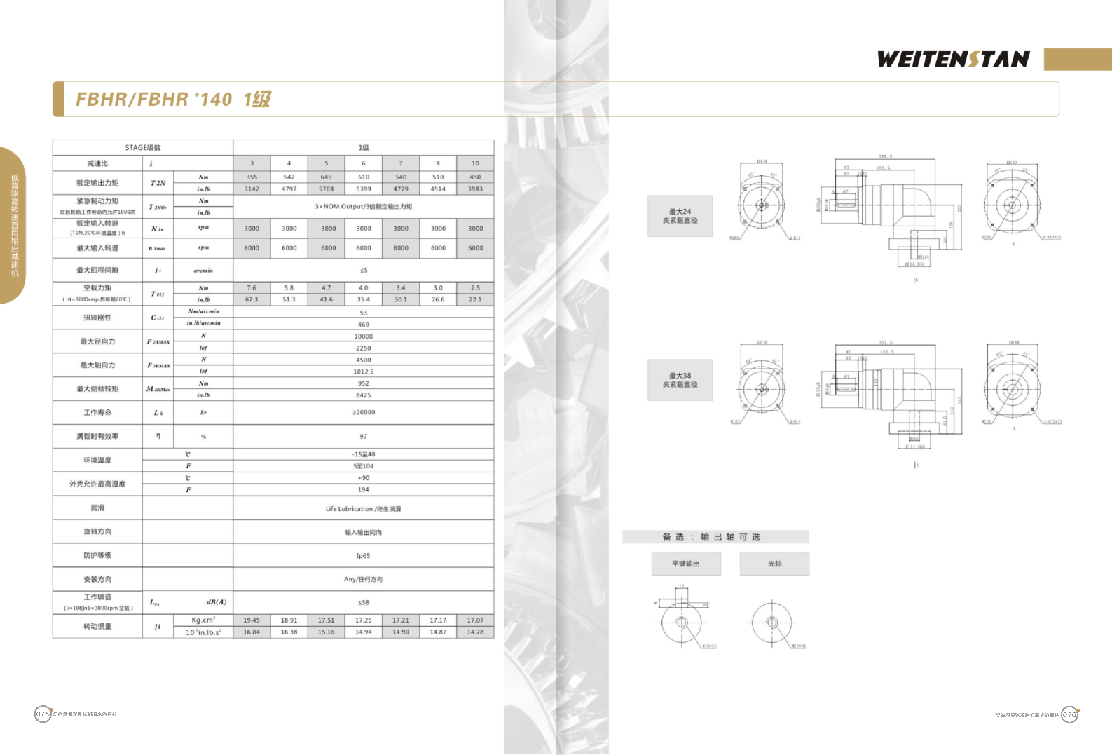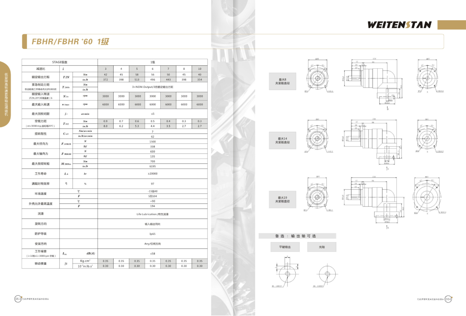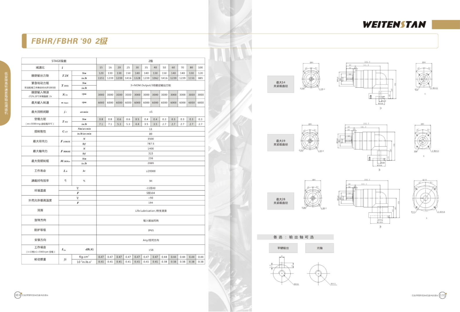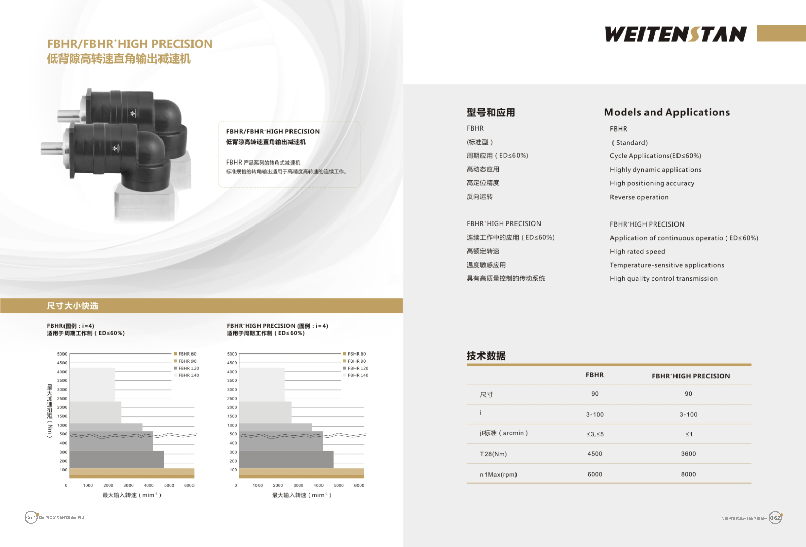 FBHR系列低背隙高轉(zhuǎn)速直角輸出減速機(jī)。 FBHR產(chǎn)品系列的轉(zhuǎn)角式減速機(jī),標(biāo)準(zhǔn)規(guī)格的轉(zhuǎn)角輸出適用于高精度高轉(zhuǎn)速的連續(xù)工作。 極高的功率密度。盡管以往系列性能極為出色,但我們成功的將扭矩提高了近40%。不斷提高極限值,典型威騰斯坦產(chǎn)品! 電機(jī)安裝簡易。電機(jī)可安全簡易的一步安裝,另外您也可以選擇威騰斯坦享有的專利權(quán)的,帶有長度補(bǔ)償軸的安裝。 任意位置安裝。不管你在哪個(gè)位置安裝,你的齒輪箱始終有相同的潤滑油/潤滑脂量。安裝靈活、齒輪箱能夠垂直、水平、與從動(dòng)軸一起向上或向下安裝。 極高的定位精度。根據(jù)用戶需求,你可獲得回程間隙小于角分的高型行星齒輪箱。這也大大提高了你應(yīng)用上的定位精度。 通過齒輪嚙合,運(yùn)轉(zhuǎn)平穩(wěn)。相比直齒嚙合齒輪箱,本公司的斜齒嚙合齒輪箱運(yùn)轉(zhuǎn)噪音減低了50dB-A,你深知50dB-A所創(chuàng)造的價(jià)值遠(yuǎn)遠(yuǎn)高于70dB-A。此外還有:不再感動(dòng)振動(dòng),運(yùn)轉(zhuǎn)平穩(wěn)到令人驚訝。 世界水平的預(yù)期壽命。原材料進(jìn)行了優(yōu)化,幾何形狀同樣進(jìn)行了優(yōu)化。